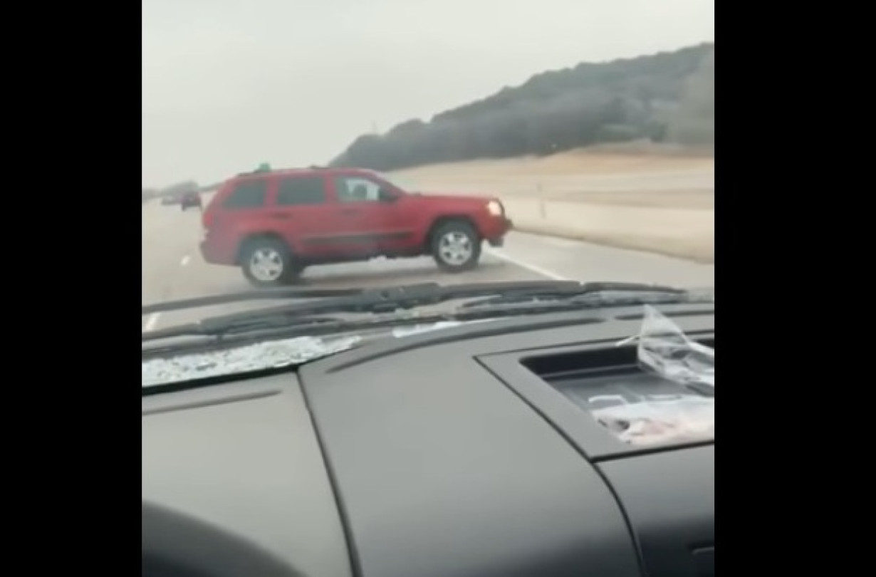 Ο οδηγός του Jeep Grand Cherokee, που οδηγούσε αμέριμνος στο Abilene του Texas, παραμονή Πρωτοχρονιάς, πρέπει να θεωρεί τον εαυτό του τυχερό. Διότι πήγαινε μάλλον υπερβολικά γρήγορα και προσπερνούσε το αυτοκίνητο με την κάμερα, που φαίνεται πως είχε πάρει κάτι χαμπάρι και πήγαινε προσεκτικά. Όταν το Jeep ξαναμπήκε δεξιά, ένιωσε πως γλιστράει και –όπως θα δείτε – είχε τη χειρότερη αντίδραση: φρέναρε. Πάνω στον πάγο. Ήταν όμως τυχερός, αφού το αυτοκίνητο έκανε δύο πλήρεις πιρουέτες γύρω από τον εαυτό του και συνέχισε την πορεία του χωρίς να βγει από το δρόμο και χωρίς να χτυπήσει πουθενά.