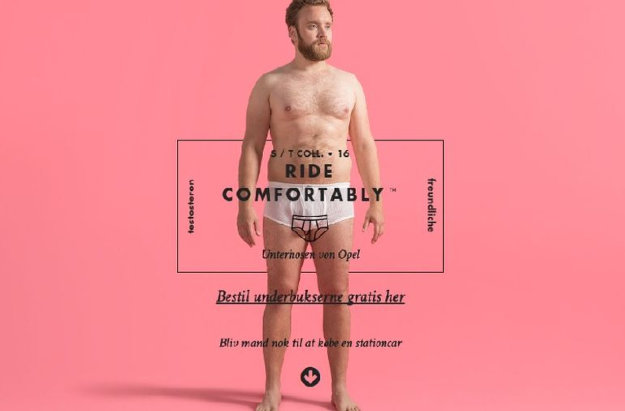 Το να αγοράσει ένας Δανός ένα station wagon είναι κάπως δύσκολο, λέει η Opel. Γι’ αυτό, με τη συνεργασία ενός δανικού οίκου μόδας, σχεδίασε το άνετο και υγιεινό εσώρουχο Ride Comfortably, εμπνευσμένο από τη σχεδίαση των γερμανικών αυτοκινήτων. Αυτό υποτίθεται ότι θα δημιουργήσει το ιδανικό περιβάλλον για τον ανδρισμό των Δανών, επαναφέροντας την τεστοστερόνη τους στα φυσιολογικά της επίπεδα.