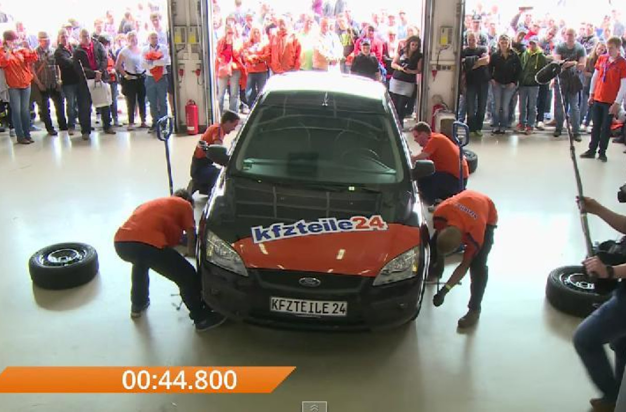 Η ομάδα της kfzteile24, αποτελούμενη από τέσσερις μηχανικούς, κατάφερε να αλλάξει και τα τέσσερα λάστιχα σε ένα Ford Focus σε μόλις 59,62 δευτερόλεπτα.