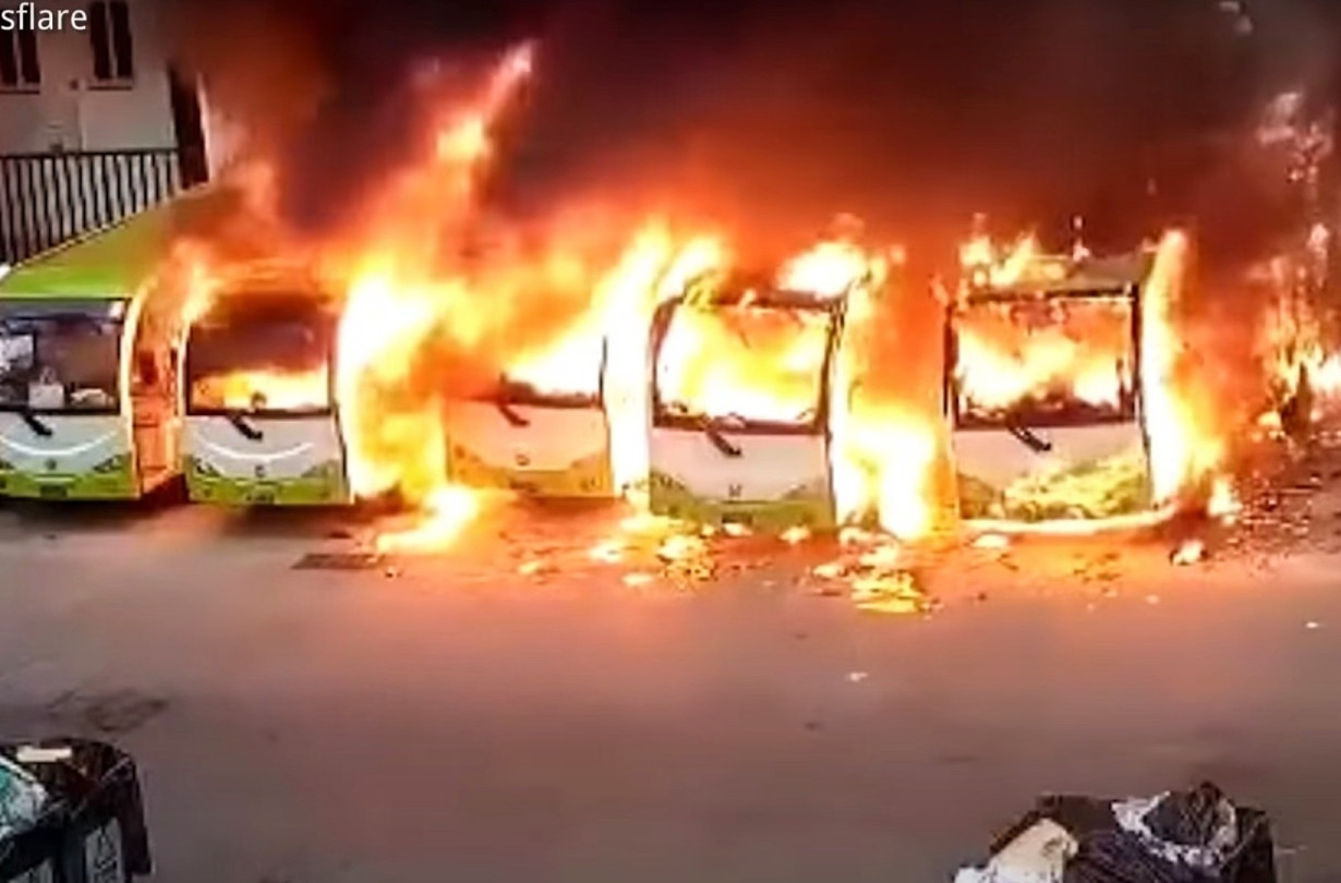 Τέσσερα λεωφορεία καταστράφηκαν ολοσχερώς χωρίς να υπάρξουν τραυματισμοί.