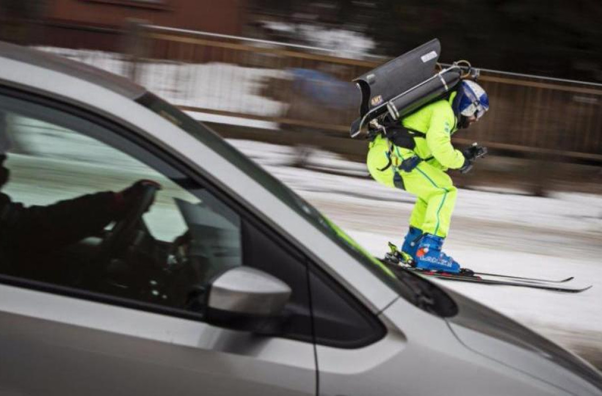 Ο Σλοβένος σταρ όμως είχε τη λύση: το Jetpack που είχε φτιάξει πριν από λίγους μήνες (βλ. δεύτερο video). Ανταποκρινόμενος στην πρόκληση ενός φίλου μέσω Instagram, o Flisar έφτιαξε μια προωθητική συσκευή σαν εκείνες του μακαρίτη Evel Knievel. Βρήκε μια τουρμπίνα τζετ των 40 kg ώσης στις 96.000 rpm, την έντυσε με κάλυμμα από ανθρακόνημα για να μην ψηθεί η πλάτη του από τις θερμοκρασίες των 850 βαθμών Κελσίου, προσάρμοσε κι ένα σύστημα ιμάντων από sky diving για να τη φοράει, και ήταν έτοιμος να κινηθεί μέχρι και με 120 km/h.
