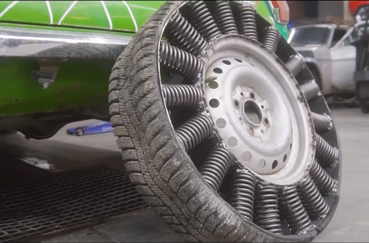 Όπως εύκολα μπορείτε να φανταστείτε, στην προκειμένη περίπτωση αποφάσισαν να κατασκευάσουν το δικό τους τροχό. Χρησιμοποιώντας ένα παλιό κέντρο από μεταλλική ζάντα, πήραν και συγκολλήσαν περιμετρικά δύο σειρές από ελατήρια. Αυτά αγκαλιάζονται από ένα μεταλλικό τσέρκι, με διττό ρόλο, όπως θα δούμε στη συνέχεια. Αρχικά βίδωσαν επάνω σε αυτό το κομμένο πέλμα ενός κανονικού ελαστικού, ενώ στη συνέχεια το αφαίρεσαν, αφήνοντας τη λεία, μεταλλική επιφάνεια να είναι αυτή που έρχεται σε επαφή με το έδαφος.