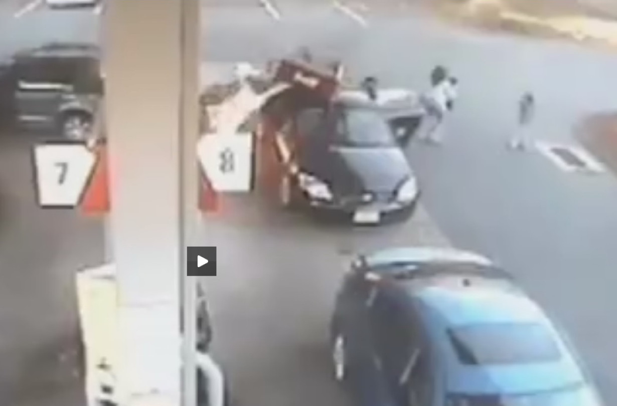 Το κομμάτι του video που πάρθηκε από κάμερα επιτήρησης κλειστού κυκλώματος στο βενζινάδικο, δείχνει τη στιγμή κατά την οποία μια γυναίκα διασώζει δύο παιδία, αρπάζοντας τα από το πίσω κάθισμα ενός φλεγόμενου αυτοκινήτου.