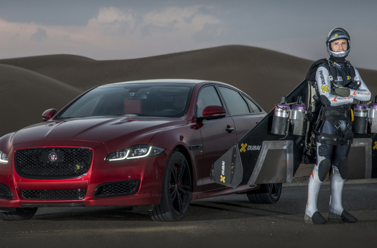 Μια Jaguar XJR 2016 σε πρωτότυπη κόντρα με έναν ιπτάμενο άνθρωπο-τζετ, στην έρημο του Dubai