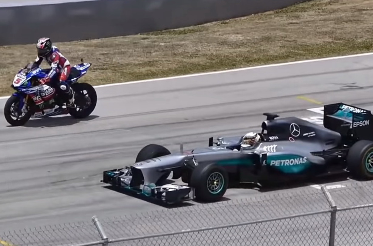 Έχουμε λοιπόν εδώ τον Hamilton με μια παλιά Mercedes W04 του 2013, απέναντι σε μια μοτοσικλέτα αγνώστων λοιπών στοιχείων – μάλλον νορμάλ R1M με αγωνιστικά αυτοκόλλητα. Άγνωστης ταυτότητας και ικανοτήτων είναι και ο αναβάτης της. Οπότε, αναμενόμενα, ο Hamilton παίζει μαζί του όπως ο γάτος με το ποντίκι.