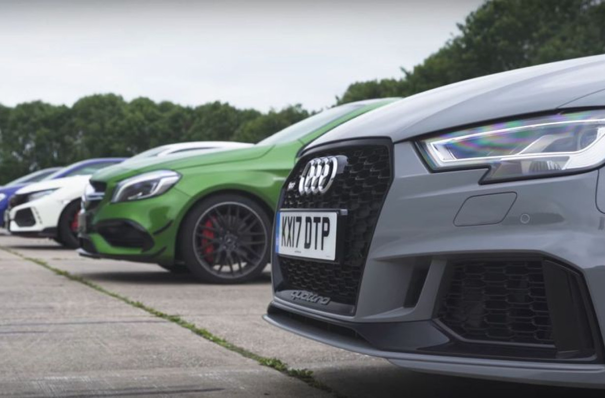 Το πιο δυνατό αυτοκίνητο του είδους είναι το Audi RS3, το οποίο μετά την τελευταία του ανανέωση αποδίδει 400 PS. Ακολουθεί η Mercedes-AMG A 45, με 381 PS. Και τα δύο αυτοκίνητα εφοδιάζονται αποκλειστικά με αυτόματο κιβώτιο διπλού συμπλέκτη επτά σχέσεων, οπότε οποιαδήποτε μεταξύ τους κόντρα έχει σίγουρα ενδιαφέρον. Το βρετανικό CarWow τα έστησε σε έναν διάδρομο προσγείωσης/απογείωσης, για να διαπιστώσει ποιο θα επικρατήσει. Όμως για να μη νιώθουν… μόνα, τα πλαισίωσε με ακόμη τρία πανίσχυρα χάτσμπακ.
