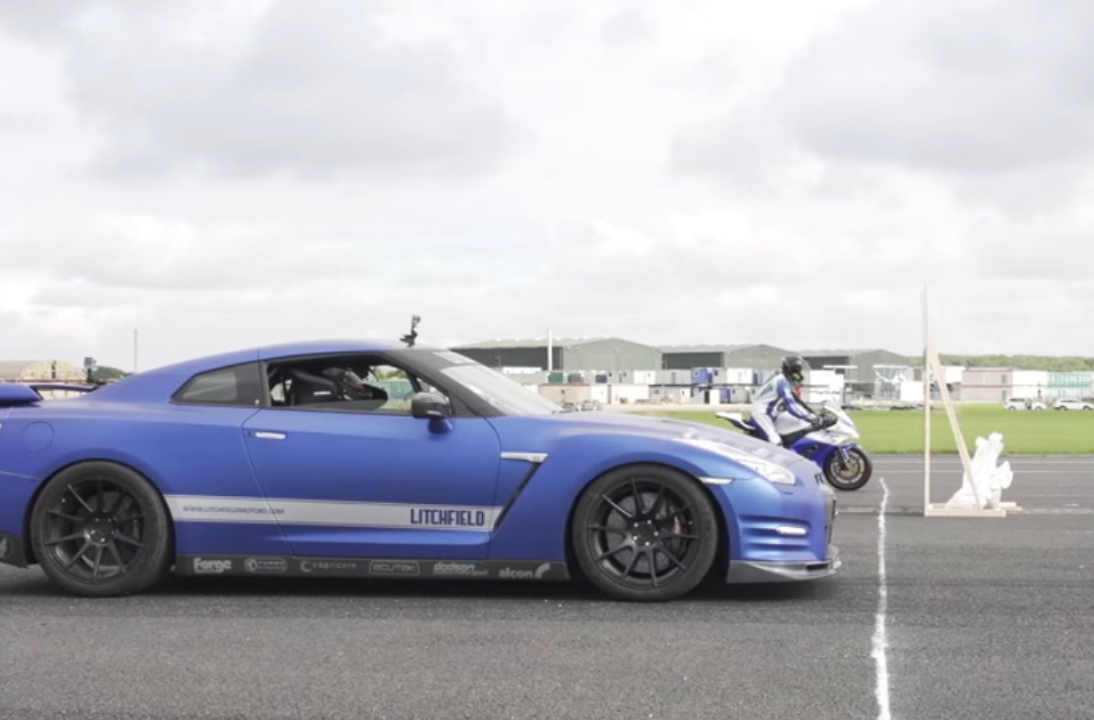 Ένα θηριώδες GT-R βελτιωμένο από τη Litchfield με 1.200 άλογα στήνεται για κόντρα με ένα επίσης φτιαγμένο σουπερμπάικ Kawasaki με 205 ίππους.
