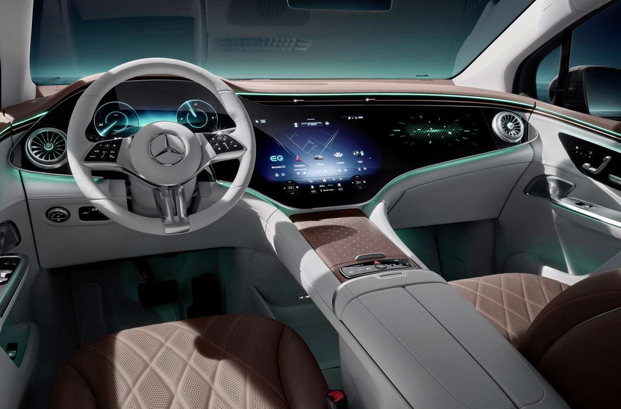 Πρακτικά μιλάμε για μία ενιαία γυάλινη επιφάνεια, η οποία εκτείνεται κατά μήκος ολόκληρου του ταμπλό. Αυτή ενσωματώνει τις μεγάλες ψηφιακές οθόνες του συστήματος MBUX με έναν ιδιαίτερα κομψό και εντυπωσιακό τρόπο. Στις υπόλοιπες λεπτομέρειες παρατηρούμε τους αεραγωγούς που είναι σχεδιασμένοι έτσι ώστε να θυμίζουν τουρμπίνες. Αντίστοιχα εκτεταμένο είναι και το σύστημα εσωτερικού φωτισμού, το οποίο ρυθμίζεται σε ένταση και χρωματισμό στα γούστα του χρήστη.