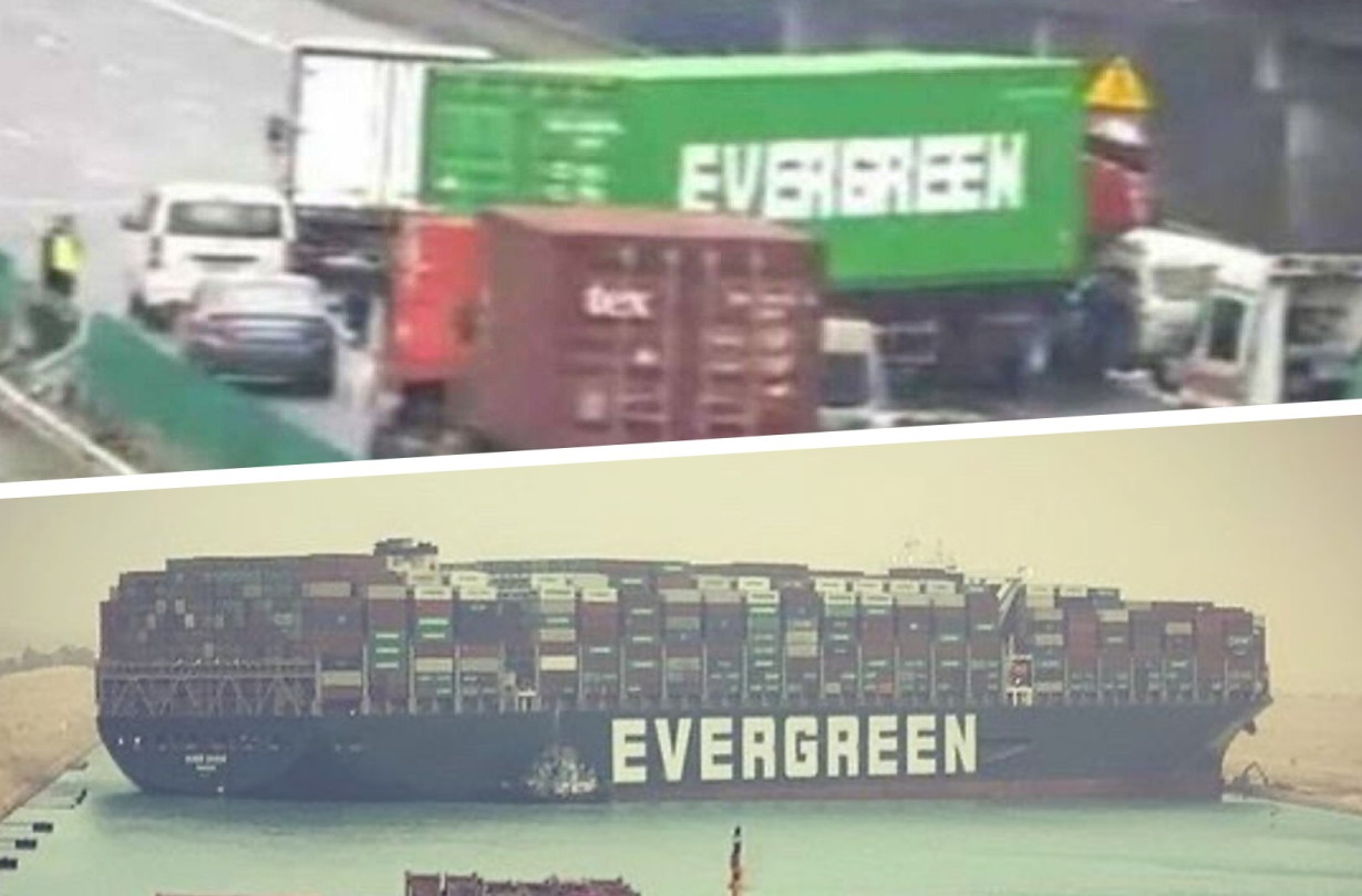 Πιο συγκεκριμένα, ένα φορτηγό που μετέφερε container της Evergreen μπλόκαρε την κίνηση των αυτοκινήτων στον αυτοκινητόδρομο σταματώντας σε γωνία 45 μοιρών μετά από σύγκρουση με διερχόμενο όχημα! Φυσικά σε αυτή την περίπτωση δεν διεκόπη το 12% του παγκόσμιου εμπορίου, ούτε είχαμε τις τεράστιες οικονομικές επιπτώσεις του κλεισίματος της Διώρυγας του Σουέζ, όμως είναι αδύνατο να αποφύγουμε τους παραλληλισμούς.