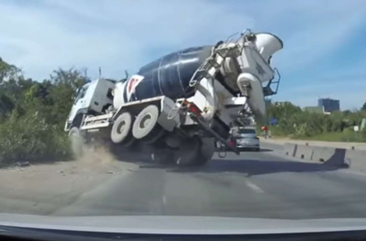 Η μπετονιέρα λοιπόν πλάγιασε δεξιά και βγήκε από το δρόμο. Ελπίζουμε χωρίς να τραυματιστεί κανένας. Ούτε κάποιος επιβάτης του αυτοκινήτου που έφαγε μια γερή ξώφαλτση, ούτε ο οδηγός της μπετονιέρας, που θα πρέπει να ξανακαθίσει στα θρανία…