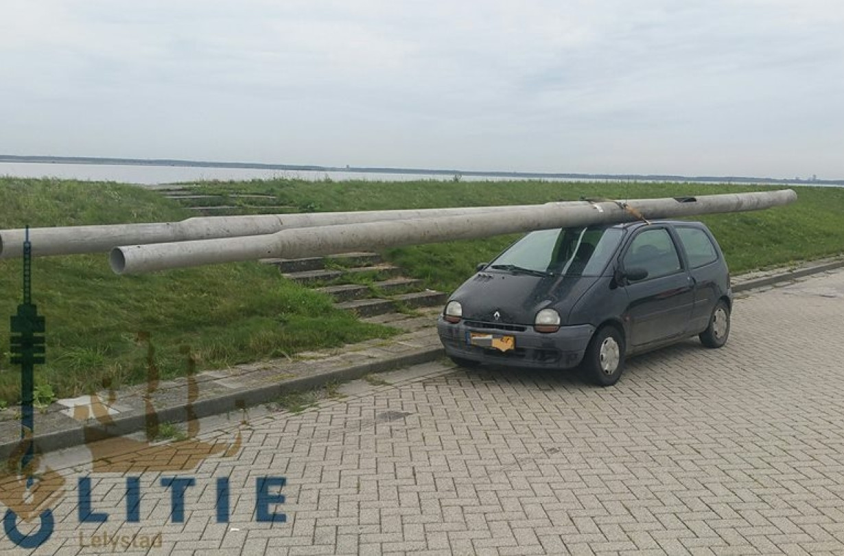 Η απίστευτη αυτή ιστορία μας έρχεται από την Ολλανδία, και συγκεκριμένα από την πόλη Lelystad. Η Αστυνομία της πόλης εντόπισε το πρωί της περασμένης Τρίτης 1 Αυγούστου ένα Renault Twingo 1ης γενιάς το οποίο μετέφερε δύο πολύ μακριά αντικείμενα στην οροφή του. Και όταν λέμε «στην οροφή του», εννοούμε ακριβώς αυτό, αφού δεν είχε μπάρες ή σχάρα οροφής, και οι δύο μεγάλοι στύλοι συγκρατούνταν στον ουρανό του αυτοκινήτου απλώς με έναν ιμάντα.