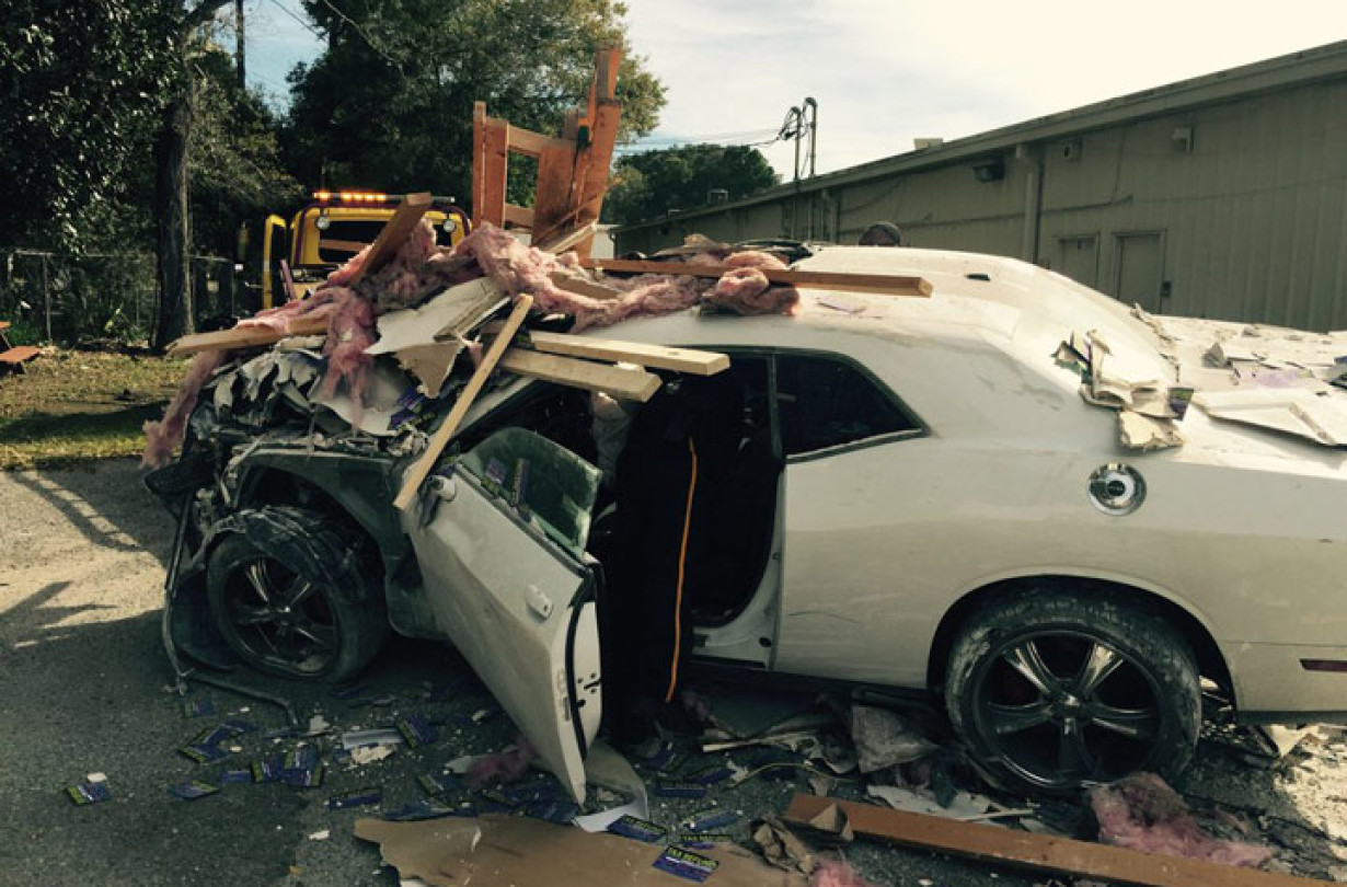 Η κατεστραμμένη Dodge Challenger που βλέπετε στη φωτογραφία είναι το θύμα μιας...αποτυχημένης απόπειρας για άλμα στο χρόνο. Αντί για το παρελθόν βρέθηκε μέσα σε ένα κτίριο...