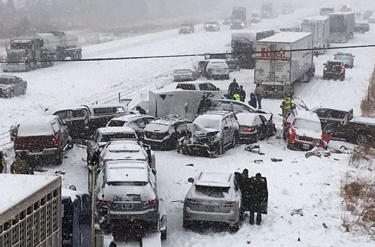 Επί πέντε ολόκληρα λεπτά αυτοκίνητα πέφτουν το ένα πάνω στο άλλο μέσα στο χιόνι και την ομίχλη αμερικανικού αυτοκινητοδρόμου.