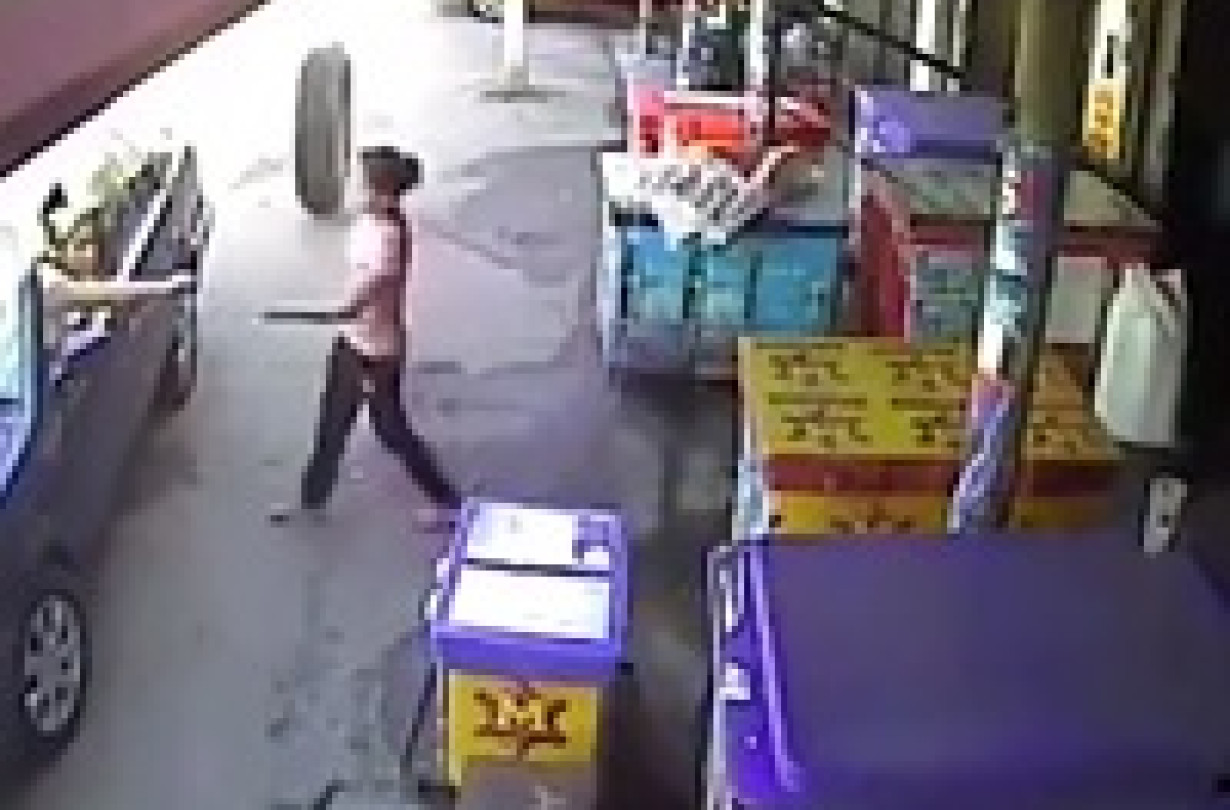 Όπως φαίνεται σε video που κατέγραψε κλειστό κύκλωμα τηλεόρασης, οδηγός είχε σταματήσει σε μίνι μάρκετ για να αγοράσει προϊόντα, όταν την ώρα που τού τα παρέδιδε η υπάλληλος, εμφανίστηκε «αδέσποτο» λάστιχο, χτυπώντας το χέρι του, με την υπάλληλο να απομακρύνεται έντρομη, κυριολεκτικά την τελευταία στιγμή.