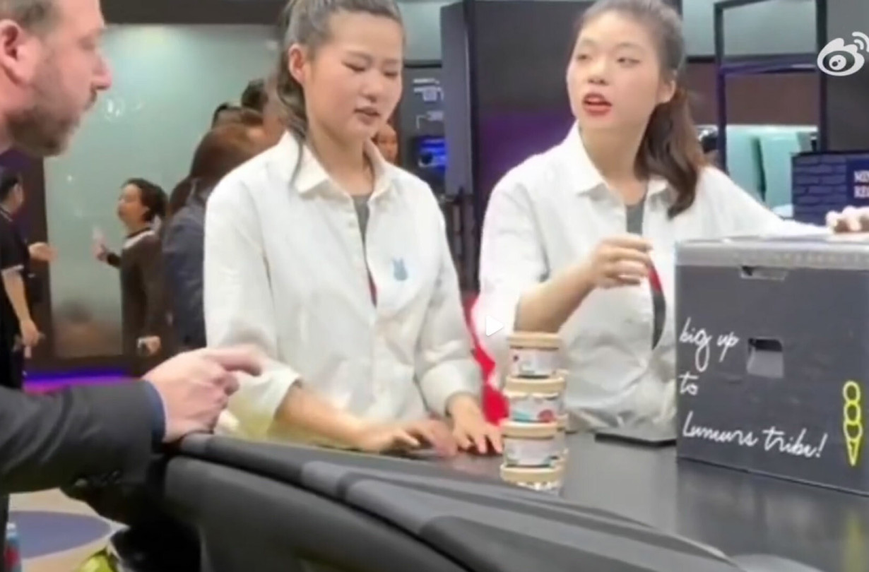 Σε ένα βίντεο φαίνονται δύο Κινέζοι εργαζόμενοι στο περίπτερο της ΜΙΝΙ να λένε σε μερικούς ντόπιους επισκέπτες ότι το δωρεάν παγωτό είχε τελειώσει, ενώ λίγα λεπτά αργότερα προσφέρουν ένα μεγάλο κύπελλο σε έναν δυτικό επισκέπτη.