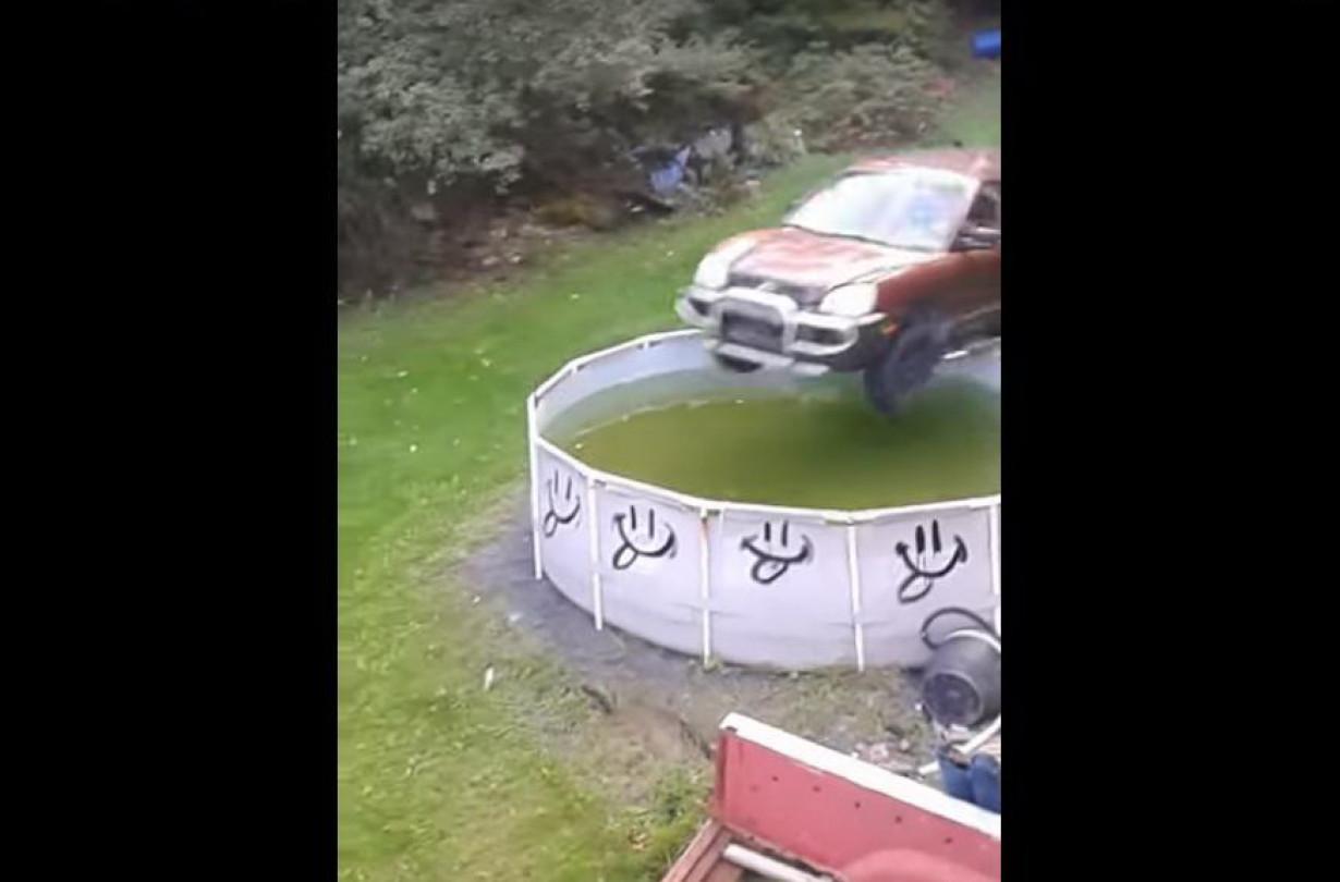Έφτιαξαν λοιπόν μια γερή ξύλινη ράμπα – ή την είχαν από πριν για βουτιές;– φόρεσαν τα (μότοκρος) κράνη τους (η ασφάλεια πρώτα απ’ όλα), πήραν φόρα από την πλαγιά και βούτηξαν με το SUV στην πισίνα! Το νερό όμως δεν άδειασε με την πρώτη, οπότε έπρεπε να το ξανακάνουν.