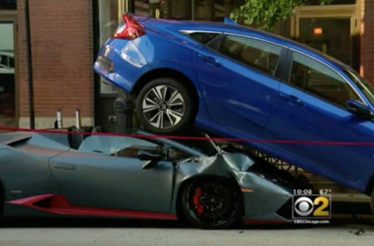Σύμφωνα με τον οδηγό της Lambo, τους χτύπησε ένα άλλο αυτοκίνητο κι αυτός, αντί να πατήσει το φρένο, μπέρδεψε τα πεντάλ και πάτησε γκάζι. Το αποτέλεσμα ήταν να βρεθούν κάτω από το Civic, αλλά ευτυχώς βγήκαν χωρίς γρατζουνιά. Μέσα στο Civic δεν υπήρχε κανένας.