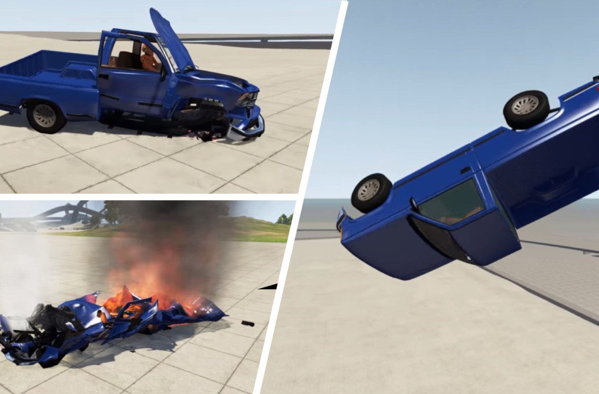 Ένα μικρό pick-up με μια κούκλα crash-test στη θέση του οδηγού χρησιμοποιήθηκε ως πειραματόζωο για αυτές τις δοκιμασίες, σε ένα ψηφιακό περιβάλλον με αρκετό χώρο για παιχνίδι. Όλα ξεκίνησαν με ρυθμίσεις για την βαρύτητα τις Γης, παρουσιάζοντας το πολύ καλό μοντέλο του BeamNG Drive όσον αφορά τις συγκρούσεις.