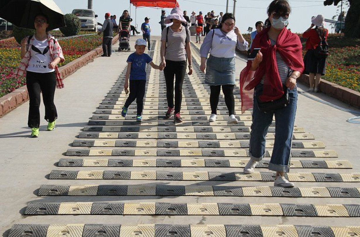 Αυτό που βλέπουμε στις φωτογραφίες τις οποίες ανέβασε στο Twitter η εφημερίδα People’s Daily China, θυμίζει περισσότερο πεδίο δοκιμής αναρτήσεων παρά πεζόδρομο. Και παρότι τα πλαστικά εμπόδια δεν καλύπτουν όλο το πλάτος του δρόμου, οπότε υπάρχει ακόμα επίπεδο έδαφος για να περπατήσει κανείς, βλέπουμε αρκετούς πεζούς να περπατούν στα σαμαράκια με το κεφάλι σκυφτό, προσέχοντας κάθε τους βήμα. Μοιάζει αδιανόητο το ότι κάποιοι θεωρούν «χαλαρωτική» αυτή τη λύση.