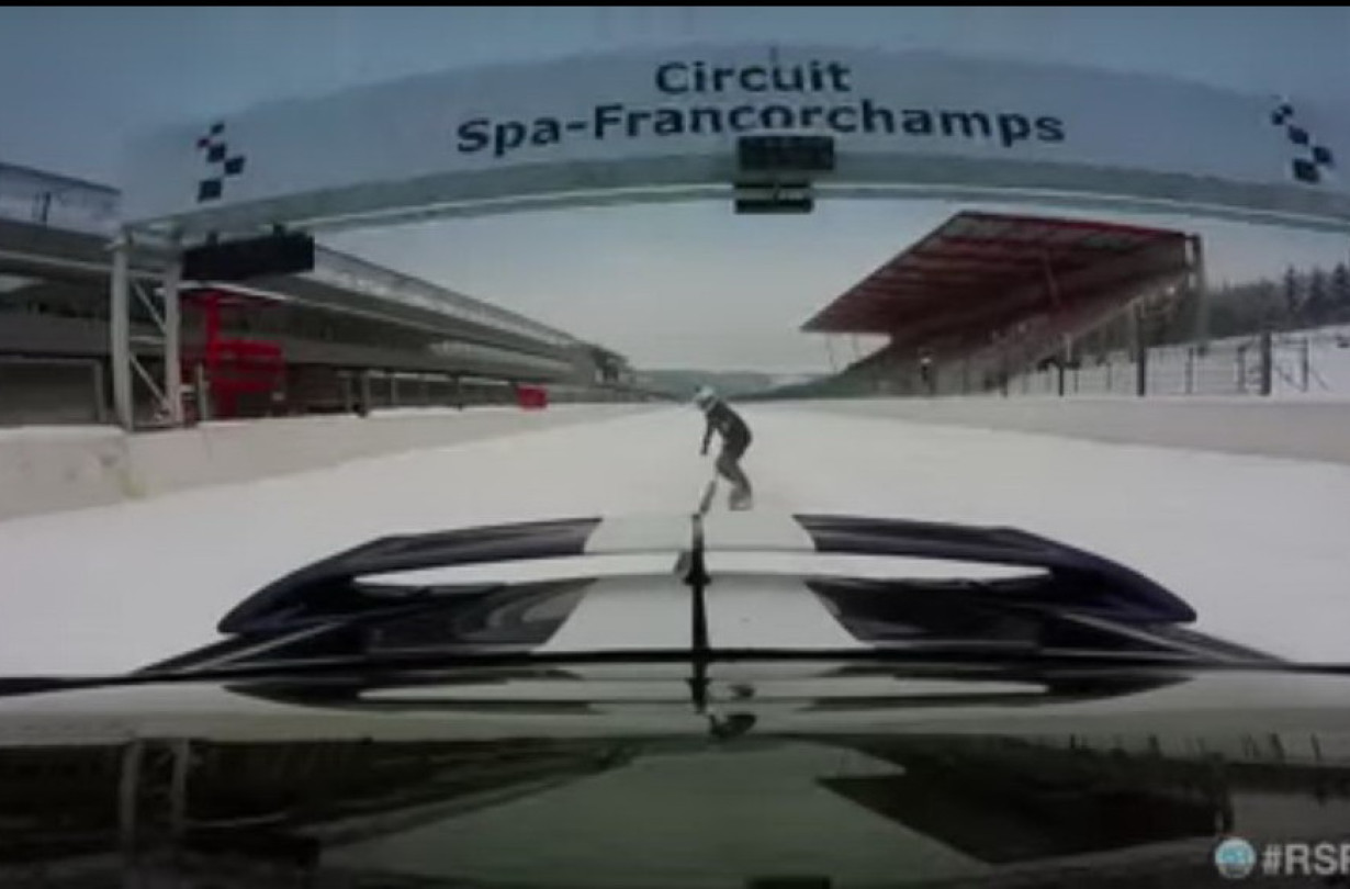 Ο εκπαιδευτής της RSR προφανώς το διασκεδάζει στο χιόνι με την τετρακίνηση και τα 540 άλογα κάτω από το δεξί του πόδι, αλλά αυτός που δίνει ρέστα είναι ο ατρόμητος snowboarder, που παίρνει γλιστρώντας τις φημισμένες και ψαρωτικές στροφές Eau Rouge, Les Combes, Pouhon, Stavelot και Blanchimont!