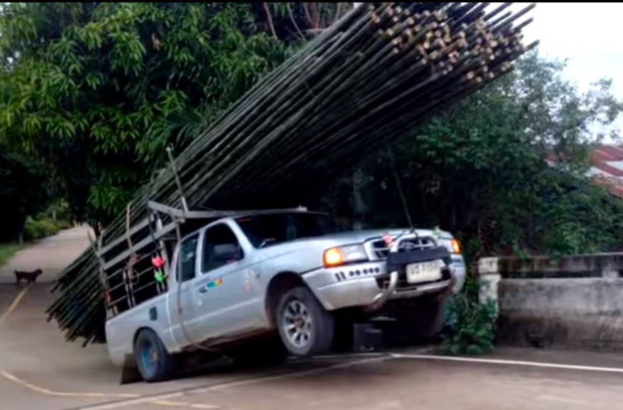 Έβαλε πάνω στο δικίνητο Ford Ranger ένα τεράστιο δεμάτι από χοντρά μπαμπού, που πρέπει να ξεπερνούσε κατά πολύ το ωφέλιμο φορτίο του αυτοκινήτου. Κι επιπλέον, δεν έδεσε το φορτίο του σταθερά.