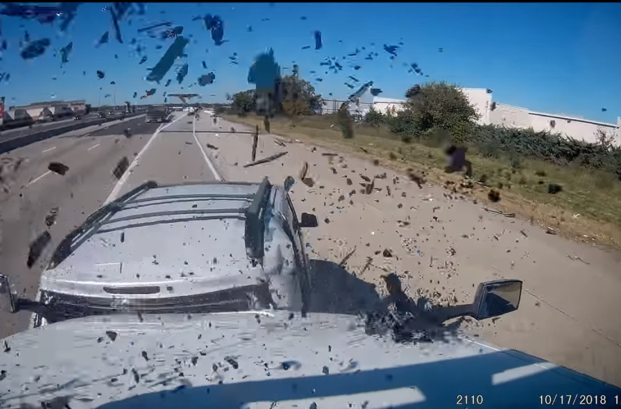 Ακολούθησε χάος, καθώς όλοι έκαναν ελιγμούς για να αποφύγουν το σταματημένο αυτοκίνητο. Με αποσπασμένη την προσοχή του, ο οδηγός της νταλίκας με την κάμερα στο ταμπλό δεν μπόρεσε να φρενάρει αρκετά κι έπεσε με δύναμη στο προπορευόμενο Toyota MPV, στέλνοντάς το για ράλι στα χώματα, ενώ από την άλλη μεριά, μια δεύτερη τεράστια νταλίκα ανατράπηκε προσπαθώντας να κάνει ελιγμό αποφυγής.