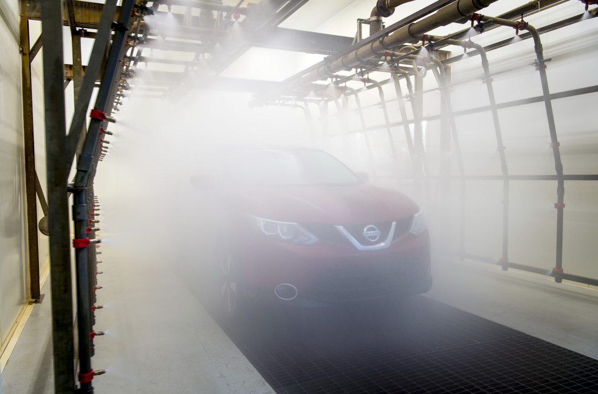 Στις συγκεκριμένες υπερσύγχρονες εγκαταστάσεις της Nissan στο Cranfield του Ηνωμένου Βασιλείου, το παραπάνω τεστ θα μπορούσε εύκολα να γίνεται με αυτοματοποιημένο τρόπο. Όμως, η αυστηρή φύση του προγράμματος ανάπτυξης των μοντέλων της Nissan, σε συνδυασμό με τις πολυποίκιλες καιρικές συνθήκες που επικρατούν ανά την υφήλιο, απαιτεί οι τεχνικοί της Nissan να «επιτίθενται» στο αυτοκίνητο, με ειδικά πλυστικά μηχανήματα υψηλής πίεσης νερού που φθάνουν τα 150 bar, όταν οι περισσότερες συσκευές του είδους λειτουργούν σε πίεση 110 bar.