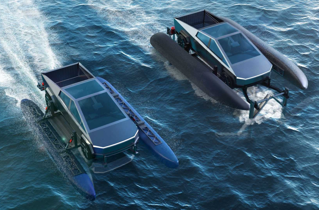 Η ιδέα ακούει στο όνομα Cybercat και Cybercat Foiler και λέει πως μπορεί να μετατρέψει το Tesla Cybertruck (που ακόμη δεν έχει μπει στην παραγωγή) σε ένα καταμαράν, με την προσθήκη βέβαια πλωτήρων και συστήματος πρόωσης.