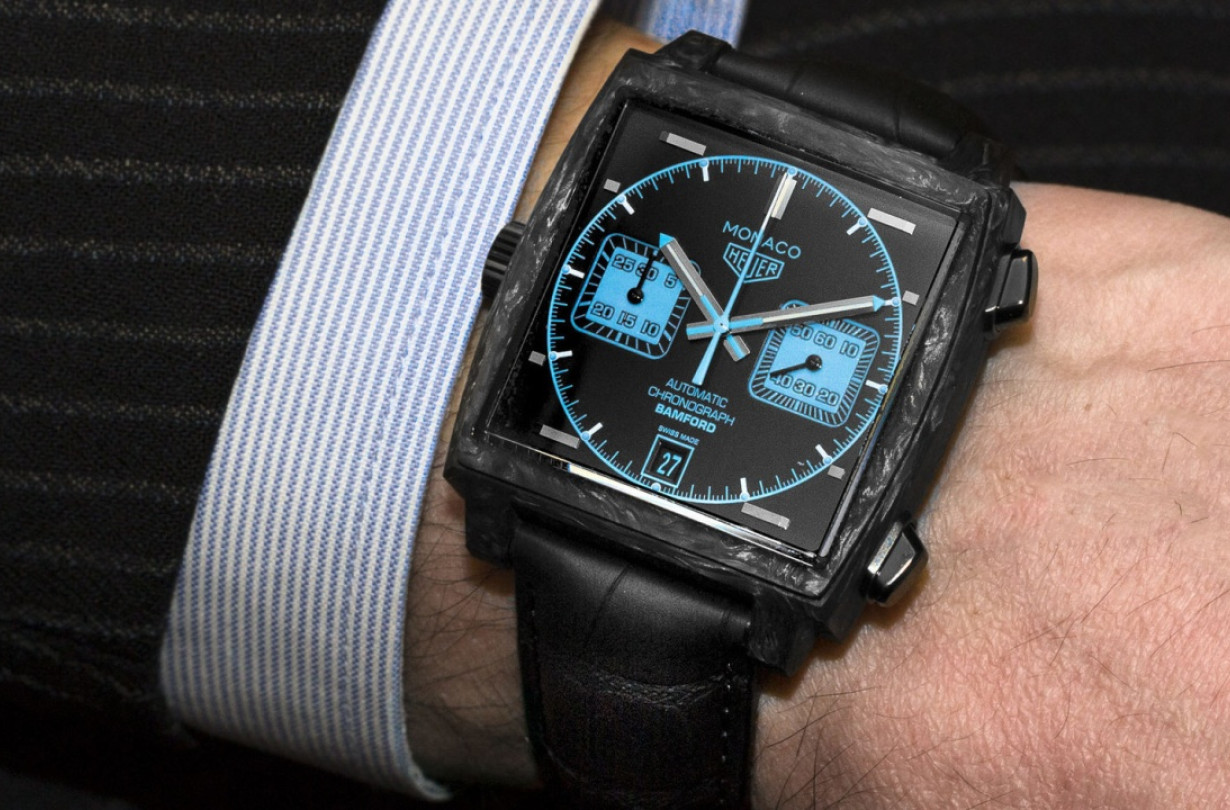 Όπως στο ορίτζιναλ Monaco, η κορόνα είναι αριστερά, για να μην πιάνεται στα αγωνιστικά γάντια. Το καντράν είναι μαύρο, με τις μπλε ενδείξεις και τους μπλε δείκτες, που χαρακτηρίζουν τα Bamford. O αυτόματος μηχανισμός του χρονογράφου είναι ο Calibre 11 της TAG Heuer και το ρολόι φοριέται στο χέρι με ένα μαύρο λουράκι από δέρμα κι ελαστικό.