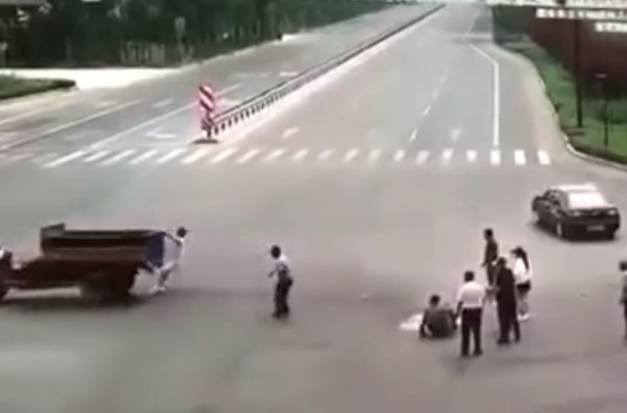 Το συμβάν έρχεται από την Κίνα. Δεν είναι σαφές το ποιος έχει προτεραιότητα, αν και το πιθανότερο είναι να την έχει το αυτοκίνητο, καθώς το φανάρι κυκλοφορίας στον κάθετο δρόμο είναι πράσινο.