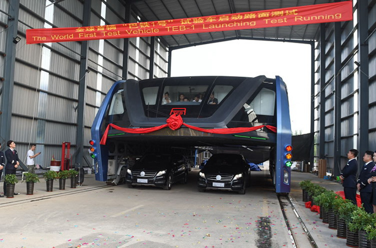 Το TEB-1 (Transit Elevated Bus – Υπερυψωμένο Λεωφορείο Μεταφοράς), που χρησιμοποιεί ειδικά αυλάκια στις δύο άκρες του δρόμου, όχι μόνο κατασκευάστηκε, αλλά ήδη δοκιμάζεται στην πόλη Qinhuangdao της βορειοανατολικής Κίνας.