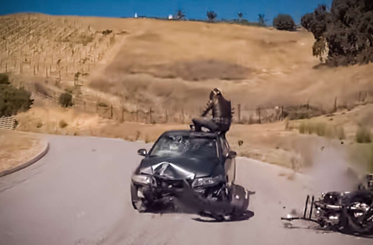 Οι δύο φίλοι κινούνται σε δευτερεύων οδικό δίκτυο και στρίβουν σε μικρότερο επαρχιακό δρόμο ακριβώς στις 20:00 το απόγευμα. Ο δρόμος καταλήγει σε λόφο από όπου θα έβλεπαν όλο το ηλιοβασίλεμα προς την silicon valley, αλλά δεν έφτασαν μέχρι επάνω. Οδηγός από το αντίθετο ρεύμα έφυγε ευθεία στην παρατεταμένη κατηφορική στροφή και συγκρούστηκε μετωπικά με τον αναβάτη της πρώτης μοτοσυκλέτας, εκτοξεύοντάς τον στον αέρα. Χτυπά το κεφάλι του στο παρμπρίζ, έπειτα στην οροφή του αυτοκινήτου αλλά και στο έδαφος και το ευτύχημα είναι πως παρά τα όσα φαίνονται στην εικόνα, φεύγει από το σημείο χωρίς τραυματισμό!