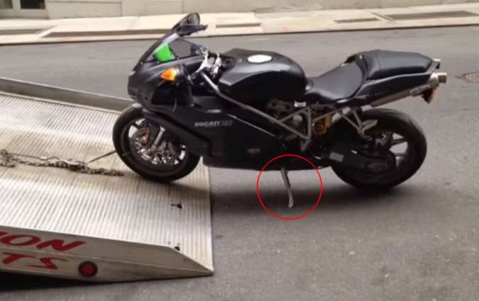 Ένα Ducati 749 φορτώνεται με τον πλέον βάναυσο τρόπο σε φορτηγό οδικής βοήθειας, ενώ είναι σε…