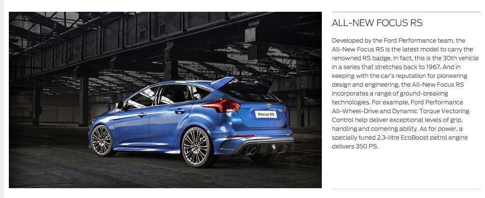 Οι συνάδελφοι δημοσιογράφοι του AutoGuide ανακάλυψαν ότι στη web σελίδα της ιρλανδικής Ford για το 85o Σαλόνι της Γενεύης αναφέρεται ότι το νέο Focus RS αποδίδει 350 PS.