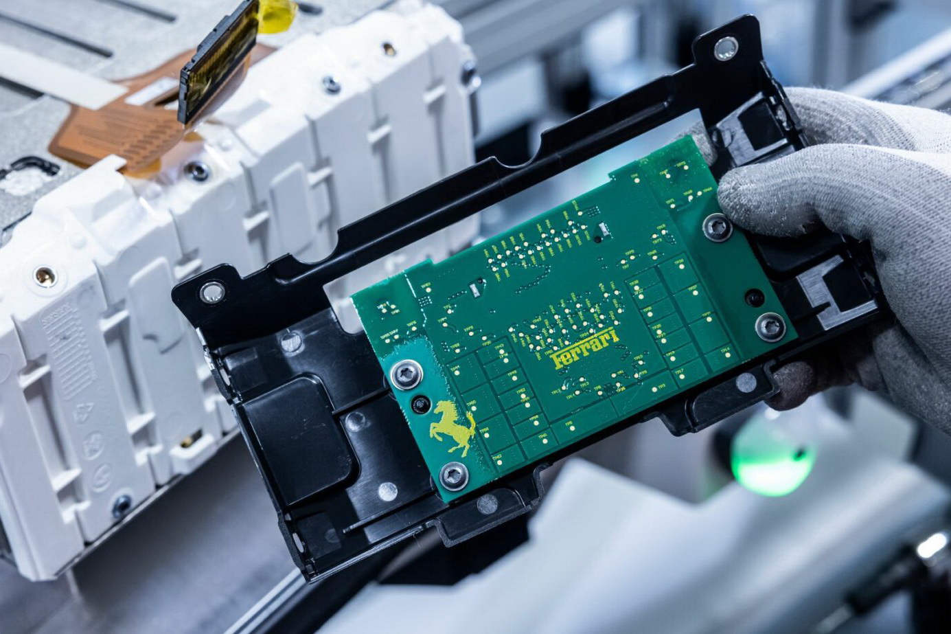Η μπαταρία βρίσκεται στο δάπεδο και αποτελείται από 15 μονάδες των 14 κυψελών «pouch» (επίπεδες, όχι κυλινδρικές), που προέρχονται από την κορεατική SK On. Η χημεία NMC επιλέχθηκε για τη μεγάλη ενεργειακή της πυκνότητα. Η συναρμολόγηση των μπαταριών, κινητήρων και inverter θα γίνεται στο νέο e-building του Maranello. Το ηλεκτρικό σύστημα λειτουργεί στα 800V (μέχρι 880V) και η ονομαστική χωρητικότητα φτάνει τις 122 kWh.