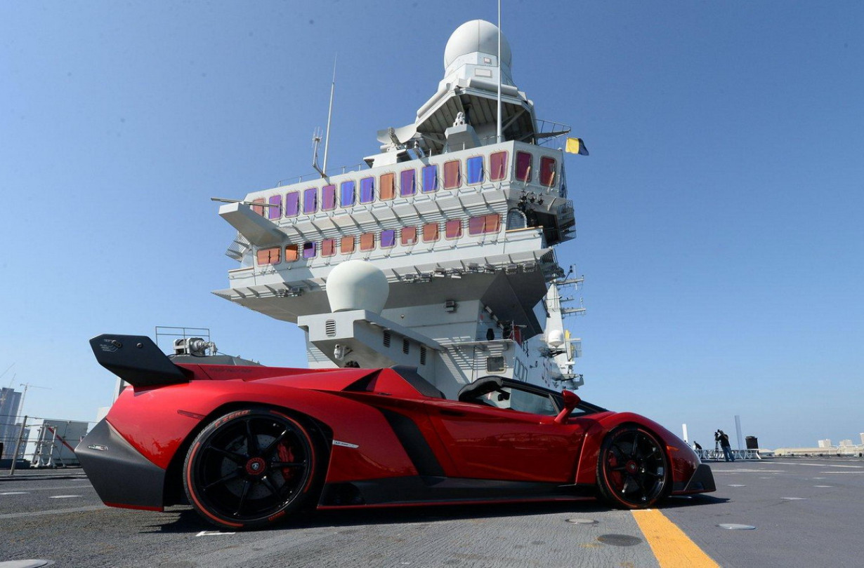 Έτσι η Lamborghini για αυτή την αποκλειστική παρουσίασή της ξεπέρασε κάθε φαντασία. Η εικονιζόμενη κόκκινη Veneno Roadster μεταφέρθηκε με ένα ιταλικό αεροπλανοφόρο και παρουσιάστηκε σε μια τελετή που περιελάμβανε επίσης μερικές σημαντικές στιγμές από την ιστορία της Lamborghini.