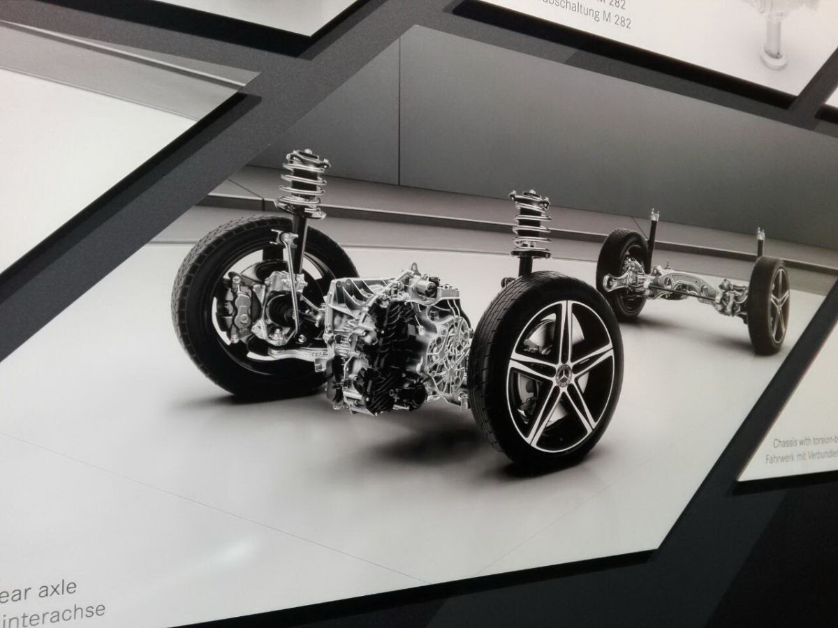 Στο πίσω μέρος οι βασικές εκδόσεις έχουν έναν νέο ημιάκαμπτο άξονα για τον οποίο η Mercedes-Benz αναφέρει ότι είναι πολύ κόμπακτ. Στις πιο σπορ πάλι αλλά και στις τετρακίνητες, υπάρχει ανεξάρτητη διάταξη πολλαπλών συνδέσμων που δίνει προτεραιότητα στην απόλυτη ευελιξία. Προαιρετικά εξακολουθούν να υπάρχουν και τα ηλεκτρονικά ελεγχόμενα αμορτισέρ, ώστε να αλλάζει ο χαρακτήρας του αυτοκινήτου με το πάτημα ενός κουμπιού.