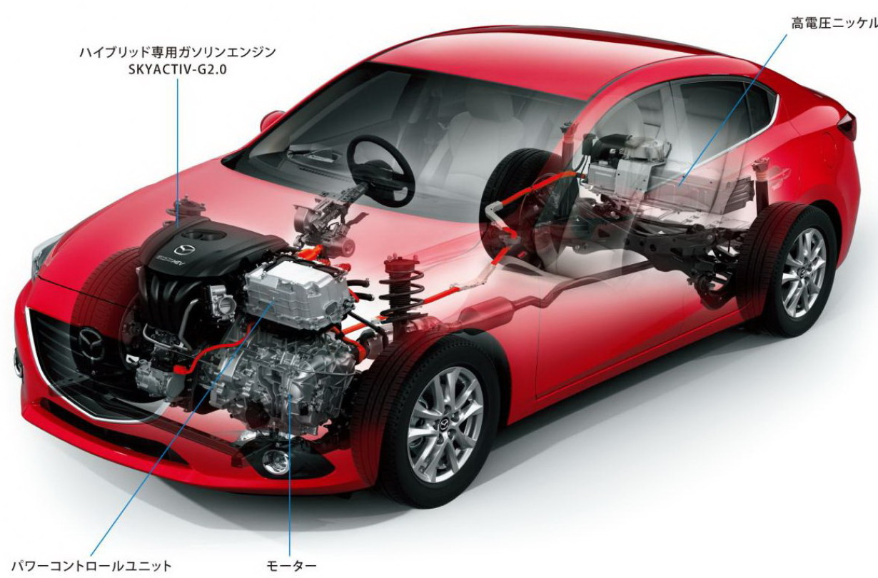Προγραμματισμένο να αρχίσει να διατίθεται στην ιαπωνική αγορά στις 21 Νοεμβρίου, το Mazda3 Hybrid έχει ένα δίλιτρο, 4κύλινδρο βενζινοκινητήρα SKYACTIV-G, ένα ηλεκτρικό μοτέρ κι ένα σύστημα μετάδοσης συνεχώς μεταβαλλόμενης σχέσης (CVT). Το κινητήριο αυτό σύστημα του επιτρέπει να έχει μια μέση κατανάλωση μόλις 3,2 lt/100 km στον τυποποιημένο αμερικάνικο κύκλο δοκιμών JC08.