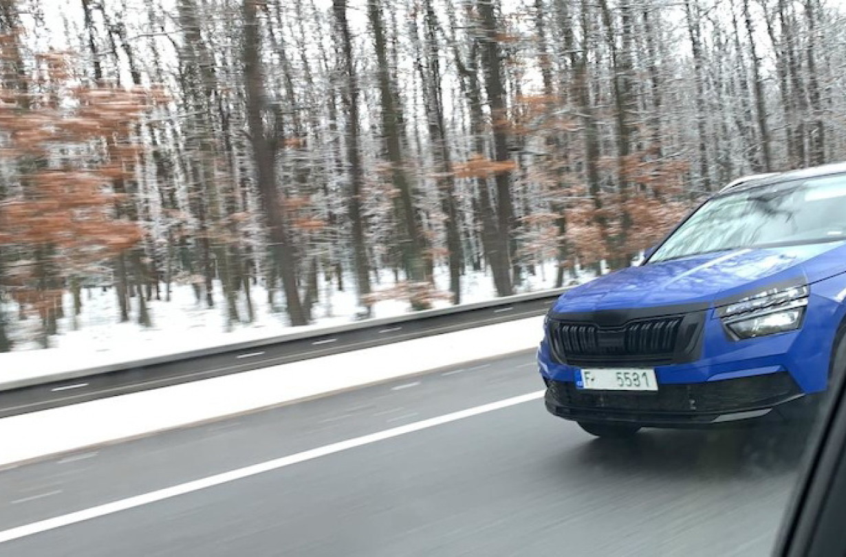Πρακτικά χωρίς καμουφλάζ, το Kamiq κυκλοφορούσε με μεγάλη ταχύτητα στον αυτοκινητόδρομο D11 μεταξύ της Πράγας και του Hradec Králové. Όπως μπορείτε να δείτε, το εμπρός μέρος αποτελεί άμεση κληρονομιά από το Vision X Concept που παρουσιάστηκε στο ελβετικό Σαλόνι Αυτοκινήτου πέρυσι και συμπίπτει με τα επίσημα σκίτσα που δόθηκαν στη δημοσιότητα πριν από λίγες μέρες.