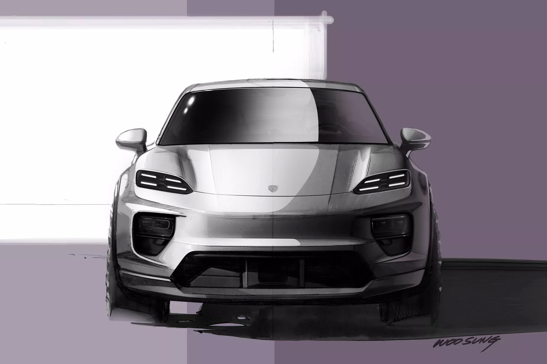 Αυτή τη φορά, δείχνει το αυτοκίνητο ολόκληρο αλλά σε σκίτσα. Μας περιμένει λοιπόν μια εμπρός όψη της ηλεκτρικής Macan, η οποία επιβεβαιώνει την ομοιότητά της με την πρόσφατα ανανεωμένη Cayenne και την Taycan. Το πίσω μέρος δείχνει μια φωτεινή λωρίδα που καλύπτει όλο το πλάτος του αυτοκινήτου, ακριβώς όπως επίσης στις Taycan και Cayenne.