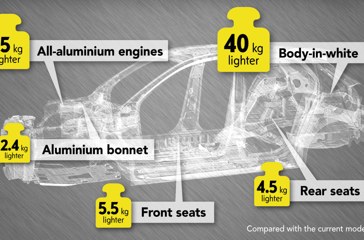 Η εκτενέστατη "δίαιτα" επετεύχθη με χρήση ψηφιακής τεχνολογίας κατά την εξέλιξη της πλατφόρμας. Το πλαίσιο είναι κατασκευασμένο από διάφορα είδη χάλυβα με προηγμένες μεθόδους συγκόλλησης με αποτέλεσμα να ζυγίζει 40 kg λιγότερο. Το αμάξωμα είναι επίσης ελαφρύτερο με αλουμινένιο καπό να εξοικονομεί 2,4 kg. Επιπλέον, οι νέοι αλουμινένιοι κινητήρες συμβάλλουν στο χαμηλό βάρος, με τον τρικύλινδρο βενζινοκινητήρα της νέας γενιάς να είναι 15 kg ελαφρύτερος από τον απερχόμενο τετρακύλινδρο με παρόμοια ισχύ. Στο εσωτερικό, τα νέα καθίσματα είναι ελαφρύτερα κατά 10kg ενώ χρησιμοποιήθηκαν νέα μονωτικά υλικά που επίσης ζυγίζουν λιγότερο.