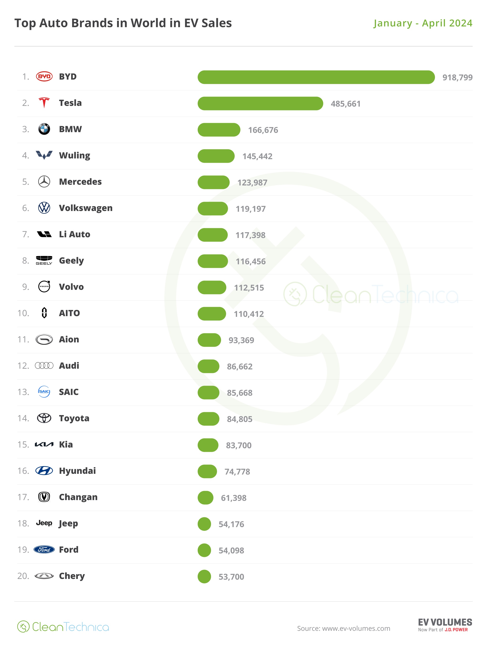 Αφήνοντας τα μεμονωμένα μοντέλα και περνώντας στις μάρκες, η μεγάλη νικήτρια του Απριλίου είναι η BYD, με πωλήσεις που ξεπερνούν τις 300.000. Όσον αφορά την Tesla, μετά την πτώση των πωλήσεων στο 1ο τρίμηνο, το αποτέλεσμα του Απριλίου δεν ικανοποιούν, με τις σχεδόν 99.000 πωλήσεις να αντιπροσωπεύουν μείωση 15% σε σύγκριση με τον ίδιο μήνα πέρυσι. Παρόλα αυτά, σημείωσε υπερδιπλάσιες πωλήσεις από την 3η BMW.