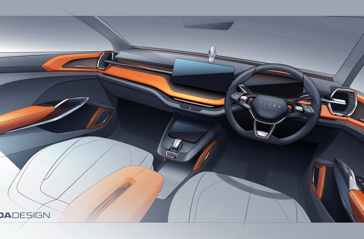 Το Vision IN μας αποκαλύπτει σε αυτό το πρώτο σκίτσο το εσωτερικό του, το οποίο δείχνει ότι η Škoda δεν έκανε εκπτώσεις στον σχεδιασμό της καμπίνας, καθώς το νέο SUV βλέπουμε ότι θα εξοπλίζεται με μια οθόνη αφής τελευταίας γενιάς και με τα ψηφιακά όργανα Digital Cockpit.