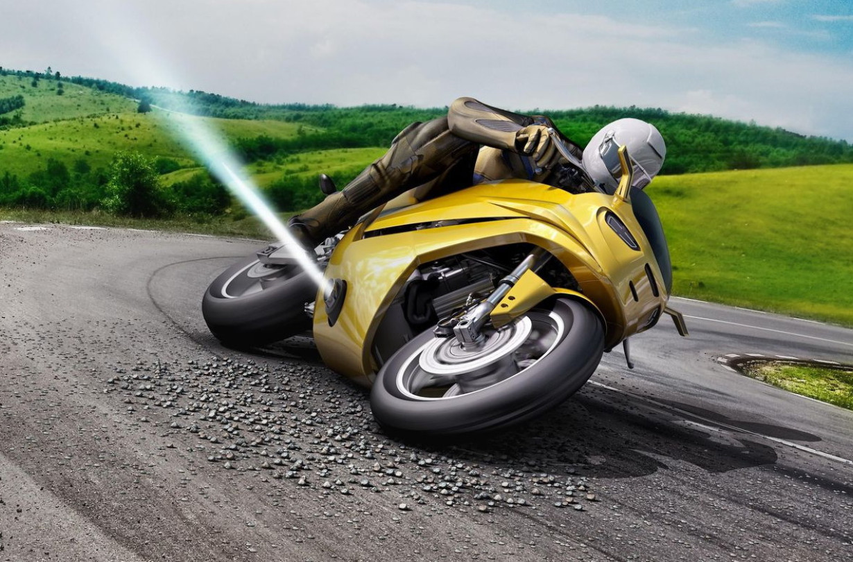 Αν η μοτοσικλέτα πατήσει σε νερά, λάδια ή χαλίκια μέσα σε στροφή, οι τροχοί γλιστρούν προς τα πλάγια και δεν μπορούν να αναπτύξουν ικανή κεντρομόλο δύναμη.