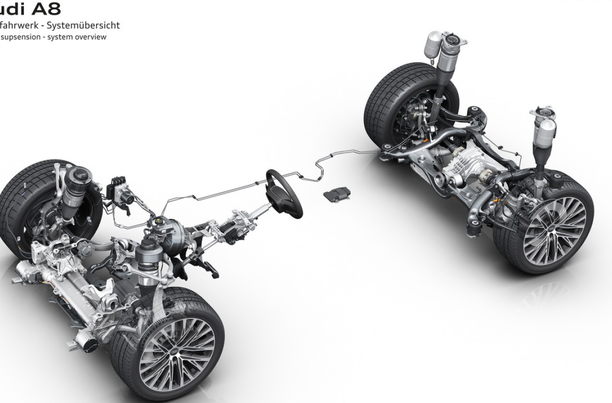 Η ενεργή ανάρτηση που διαβάζει το δρόμο είναι παρόμοια με την Magic Body Control της Mercedes S-Class, αλλά στο νέο Audi A8 συνδυάζεται με σύστημα τετραδιεύθυνσης. Χάρη στην τετραδιεύθυνση, η σταθερότητα συνδυάζεται με άμεση απόκριση του τιμονιού κι έναν κύκλο στροφής μικρότερο από εκείνον του Α4.