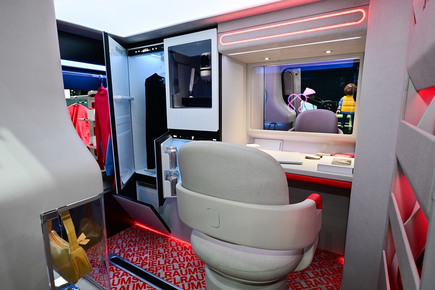 Το Spielraum Studio, σχεδιασμένο για επιχειρηματίες που ταξιδεύουν συχνά και χρειάζονται τόσο χώρο εργασίας όσο και αποθηκευτικό χώρο, διαθέτει το modular styler της LG, έναν έξυπνο καθρέφτη και μια καφετιέρα, όλα βελτιστοποιημένα για το εσωτερικό του PV5, του πρώτου αποκλειστικού PBV της Kia. Η ενσωματωμένη τεχνητή νοημοσύνη ενισχύει περαιτέρω την ευκολία, προσφέροντας εξατομικευμένες λύσεις και βελτιστοποιημένες ρυθμίσεις φροντίδας ρούχων με βάση το πρόγραμμα του χρήστη.