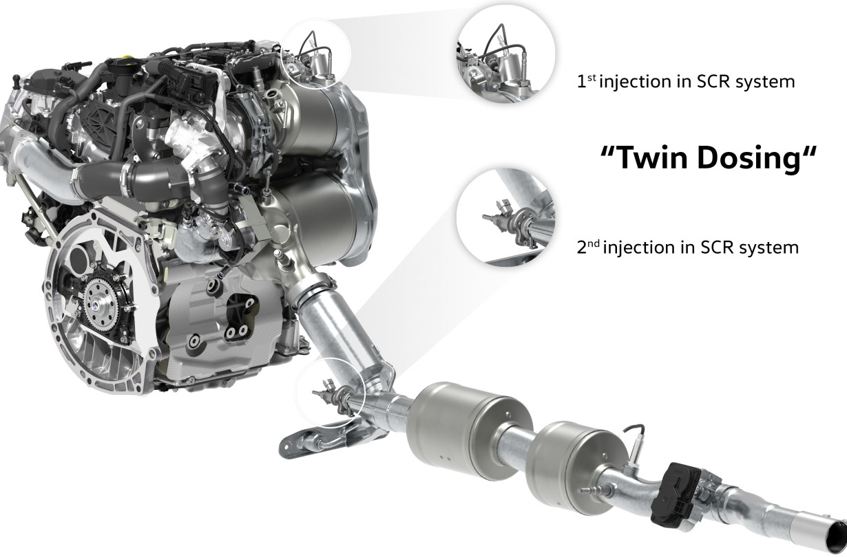 Η Volkswagen προχωρά ένα βήμα παραπάνω την διαδικασία κατάλυσης, αποκαλύπτοντας ένα διπλό καταλύτη (δύο μονάδες σε σειρά) με δύο εγχύσεις Adblue πριν από τους δύο καταλύτες. Το πλεονέκτημα του δεύτερου είναι ότι βρίσκεται πιο μακριά από τον κινητήρα και συνεπώς είναι λιγότερο θερμός, επιτρέποντας την καλύτερη επεξεργασία των ρυπογόνων εκπομπών. Ακόμη και αν η Volkswagen δεν το προσδιορίζει, το σύστημα αυτό θα πρέπει να επιβάλλει μεγαλύτερο ρεζερβουάρ για το Adblue.