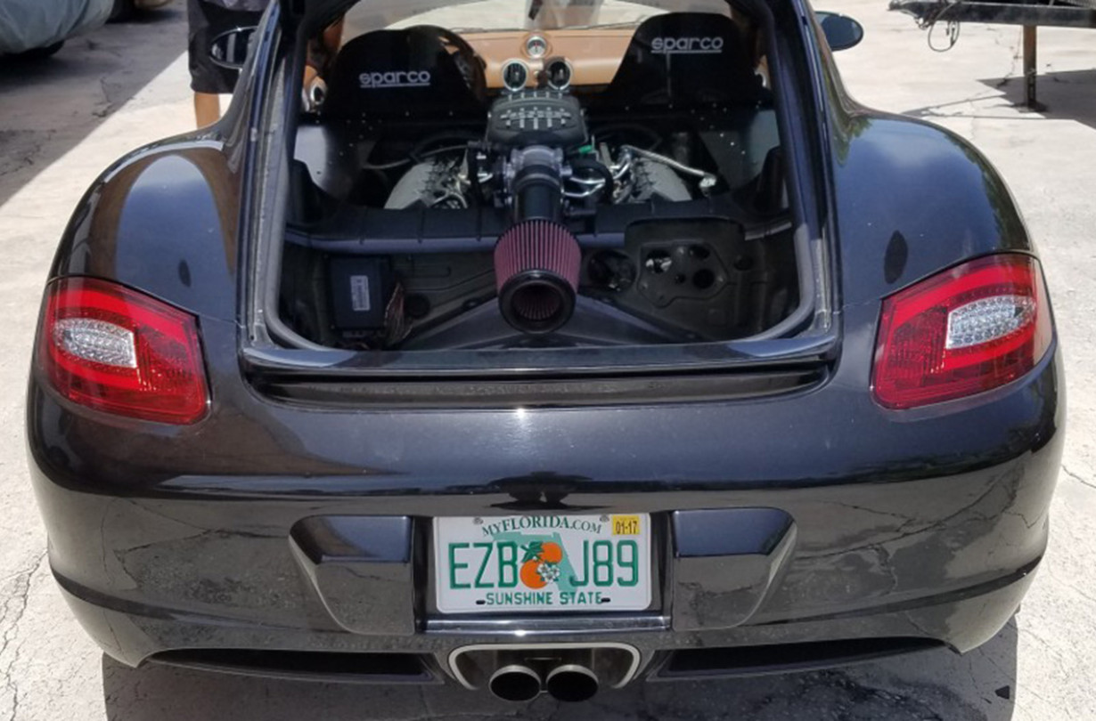 Η συγκεκριμένη Cayman που βλέπετε έχει τον V8 των 5,0 λίτρων της Mustang GT. Το μοτέρ της Ford Motor Company που εξοπλίζει το pony car στην έκδοση GT πωλείται και χώρια από την φίρμα, κουτάτο, και σύμφωνα με την ίδια αποδίδει 438 ίππους στις 7.500 rpm και 52,5 kgm στις 4.500 rpm.