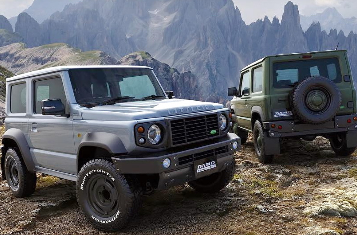 Δεδομένης της απόλυτα κυβικής μορφής του, η νέα γενιά Suzuki Jimny προσφέρεται ιδιαίτερα για ασκήσεις του είδους. Ο Ασιάτης βελτιωτής μόσχευσε στο μικρό 4x4 βαφή παρόμοια με εκείνη του βρετανικού off-roader, μια σχάρα οροφής με μπάρα φωτισμού LED, βαριά χωματερά λάστιχα, εντελώς ανασχεδιασμένη μάσκα και φανάρια που μιμούνται αυτά του Defender. Αν και δεν υποστηρίζει με μεγάλη πιστότητα το «πρωτότυπο», το αποτέλεσμα δεν παύει να είναι ενδιαφέρον.