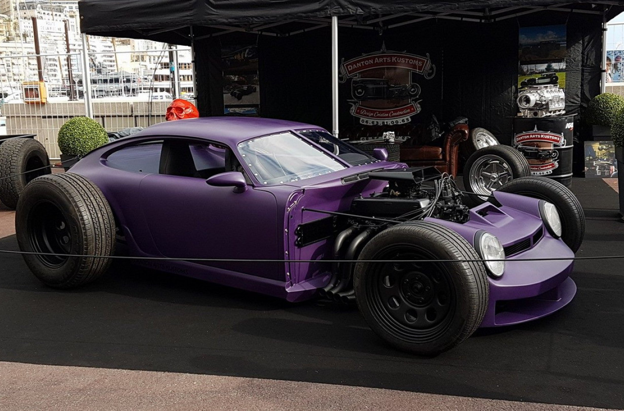 Και σαν να μην έφτανε αυτό, έβγαλε τους τροχούς έξω από το αμάξωμα, όπως στα μονοθέσια, κι έκανε και μια σειρά από άλλες επεμβάσεις για να μετατρέψει την 911 σε αμερικάνικο “Rat Rod”. Η τελική πινελιά –ή η χαριστική βολή, αν προτιμάτε– ήταν το περλέ μοβ χρώμα με το οποίο έβαψε το αποκριάτικο δημιούργημα.